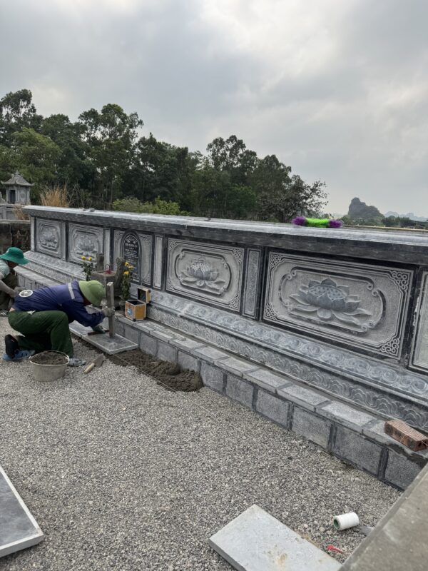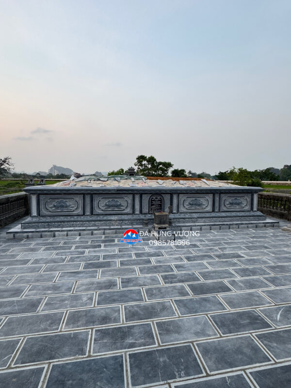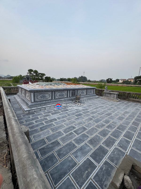Với thiết kế mẫu mộ kích thước rộng 7120 x sâu 4640 chất liệu được lựa chọn là đá xanh đen truyền thống.